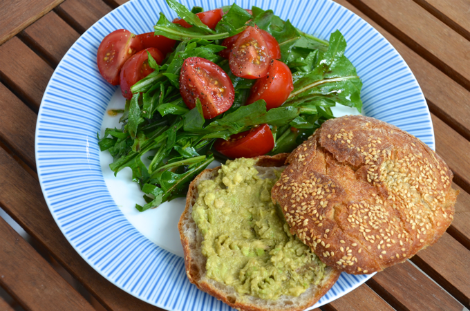 Der Beitrag soll allerdings mehr zur Inspiration, als als Rezept dienen. Es ist so simpel, dass man eigentlich kein Rezept braucht. Ich habe das Essen bewusst ziemlich einfach gehalten. Ohne fancy Extras: Ein einfacher Rucolasalat mit Tomaten und ein einfaches Brötchen mit Avocadocreme.