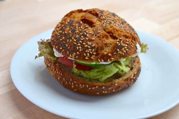 Freitag habe ich nur ein Brötche gegessen, was ich mit dick Frischkäse bestrichen und mit Salat, Tomaten und Gurken belegt habe