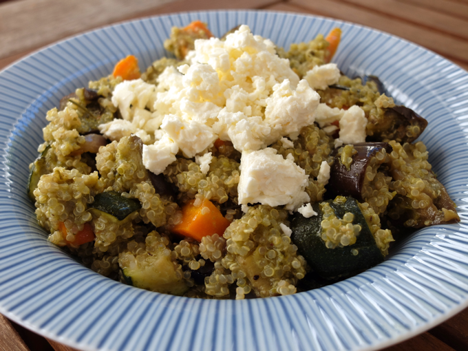 Endlich ist der Sommer zurück in Berlin! Deshalb bevorzuge ich auch wieder Salate, statt Wohlfühlsuppen und andere warme Gerichte zu kochen. Dieser hier ist nicht der Schönste, ich weiß, aber schmecken tut er fantastisch! In der letzten Woche habe ich mir ein riesiges Blech Ofengemüse gemacht, das Rezept dazu findet ihr hier. Eine Hälfte habe ich mit Humus gegessen. Die andere Hälfte kam einen Tag später zum Einsatz und zwar zusammen mit gekochtem Quinoa! Eigentlich wollte ich Couscous verwenden, der war nur leider alle… Aber wie immer gilt: Nehmt  die Beilage, die euch am besten schmeckt und die ihr gerade da habt! Sei es Couscous, Bulgur, Quinoa, Reis oder was auch immer.  Da das Gemüse noch kalt war, weil es aus dem Kühlschrank kam, wurde es ein lauwarmer Salat daraus, perfekt für die heißen Tage, wie ich finde!Quinoasalat mit Ofengemüse Quinoasalat mit Ofengemüse