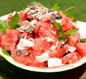 Vor ein paar Tagen war ich auf einen Geburtstag eingeladen und sollte was zum Essen mitzubringen. Mir war schon vorher klar, dass ich den ganzen Tag arbeiten würde und keine Zeit hätte etwas aufwändiges vorzubereiten. Glücklicherweise kam mir kurz vor dem Fest dieses Rezept zwischen die Finger. Ich habe es auf Elas Blog „Transglobal Pan Party“ gefunden. Es überrascht, weil es mal ganz was ganz anderes ist als der übliche Pasta- oder Kartoffelsalat. Ich habe die Zutaten einfach alle zum Fest mitgebracht. Als ich angekommen bin, habe ich mich kurz in die Küche verzogen, um den Salat vorzubereiten. Das Geburtstagskind und die Gäste waren begeistert und ich total erfreut und überrascht über diese Reaktionen! Die Kombi aus Wassermelone, Feta und Minze ist wirklich fantastisch.