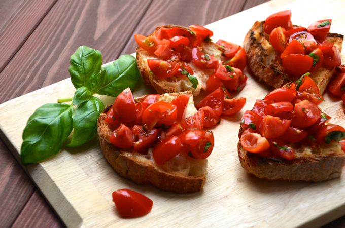 Ich habe noch einen italienischen Klassiker für euch: Bruschetta. Achtung, es folgt eine kleine Info zur italienische Aussprache: Man sagt „BrusCHetta“. Nein, nicht Brussssccchheetta, eher „Brusketta“. Gut, nun also weiter im Text… Tomaten und Brot, etwas Öl und Knoblauch. Fertig ist ein kleiner Snack oder eine wunderbar frische Vorspeise. Man kennt das Gericht, aber ich habe es erst in Italien wieder richtig zu lieben gelernt. Falls mal spontan Freunde vorbeikommen, ist das genau die richtige Kleinigkeit zum anbieten. Und günstig ist es noch dazu! Vielleicht zum Fußball gucken…?