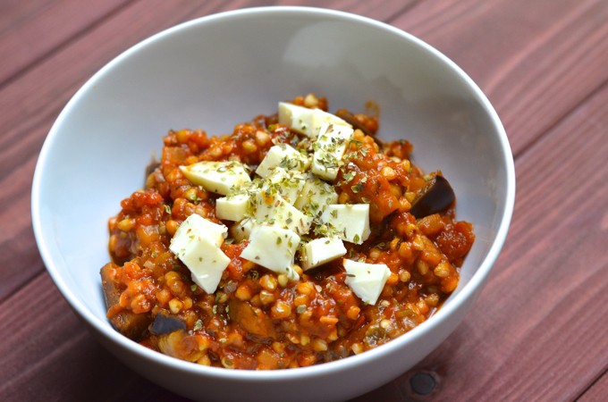 Alternativ zu Buchweizen könnt ihr natürlich auch Pasta verwenden. Diese solltet ihr dann erst 8-10min vor Ende der Garzeit zur Aubergine und der Tomatensoße hinzufügen.